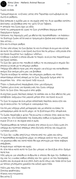 Το περιστατικό για το οποίο μας ενημερώνουν έλαβε χώρα στο Περιστέρι όταν ένας ενήλικος γάτος, τραυματισμένος από χτύπημα αυτοκινήτου, εγκλωβίστηκε σε σωλήνα ρείθρου. Οι εθελοντές αναφέρουν: ” Ενήλικος γάτος στο Περιστέρι εγκλωβισμένος σε σωλήνα ρείθρου. Κατά τις μεσημεριανές ώρες το ζώο χτυπήθηκε άσχημα από διερχόμενο όχημα. Κάτοικοι της περιοχής μαζί με εθελοντές προσπάθησαν να πιάσουν το δύστυχο ζωάκι αλλά εκείνο τρομαγμένο βρήκε εκεί καταφύγιο, πού αλλού….; Στο κοντινότερο ρείθρο.” Και συνεχίζουν: “Όντας υπό στρες το ζώο βρήκε το κοντινότερο άνοιγμα και κύλισε σε αυτό του οποίου η κεντρική σωλήνα πέντε μέτρων οδηγούσε στα κεντρικά δωμάτια των ομβρίων υδάτων.”