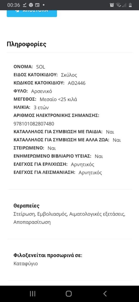 Ο Σολ ήταν αδεσποτάκι του Δήμου Αθηναίων το οποίο φιλοξενούνταν επί πληρωμή στην πανσιόν συμβεβλημένου με τον Δήμο κτηνιάτρου. Ο μικρός υπέφερε από παγκρεατίτιδα και δυστυχώς δεν τα κατάφερε. Για τον θάνατό του, ο οποίος επήλθε πολύ πρόσφατα, είχαμε άμεση ενημέρωση από τον κτηνίατρο καθώς και πλήρες ιστορικό και αιτιολόγηση. Παράλληλα ενημερωθήκαμε ότι θα μεταφερθεί για αποτέφρωση κάτι που δεν είχαμε κανένα λόγο να αμφισβητήσουμε, διαφορετικά θα τον μεταφέραμε στο ΔΙΚΕΠΑΖ με το οποίο συνεργάζεται ο Δήμος και διαθέτει αποτεφρωτήριο. Αναμένουμε τη νεκροψία από ανεξάρτητο κτηνίατρο και επιφυλασσόμεθα παντός νομίμου δικαιώματός μας”.