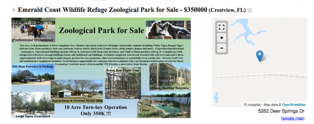 Από τις πιο παράξενες αγγελίες πώλησης είναι αυτή ενός ζωολογικού κήπου ο οποίος βρίσκεται στη λίστα craiglist και περιμένει τον επόμενο ιδιοκτήτη. Ο ζωολογικός κήπος λέγεται Emerald Coast Wildlife Refuge Zoological Park, είναι ιδιωτικός και βρίσκεται στην πόλη Crestview στη Φλόριντα.