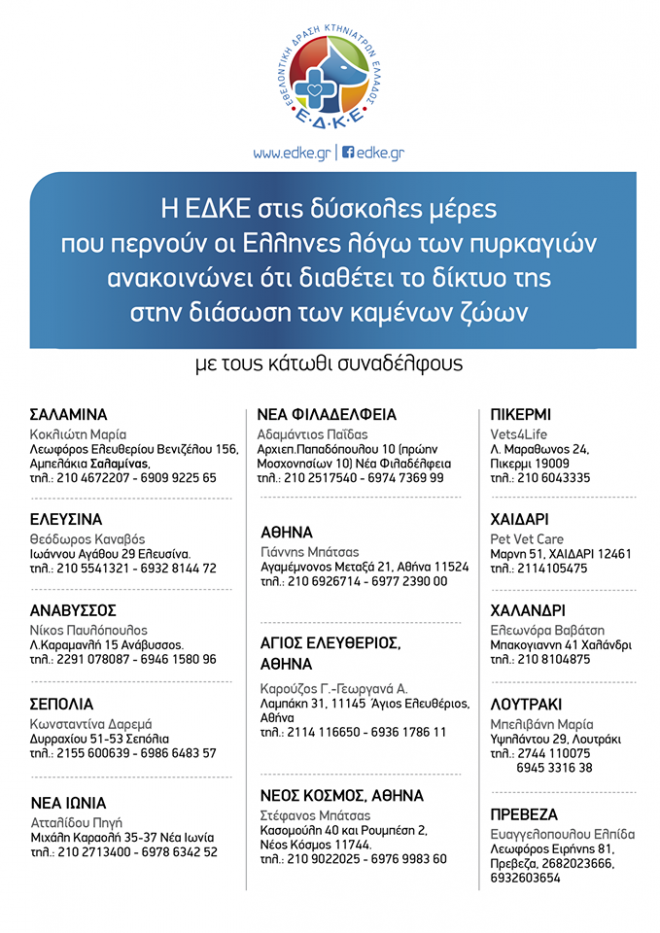 -Κτηνιατρείο στην Κηφισιά Αττικής δέχεται όλο το 24ωρο ζώα από τις πυρόπληκτες περιοχές για περίθαλψη. Tηλέφωνα: 2108013302, 6987153151.