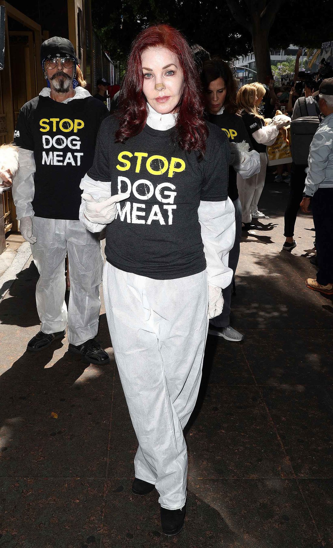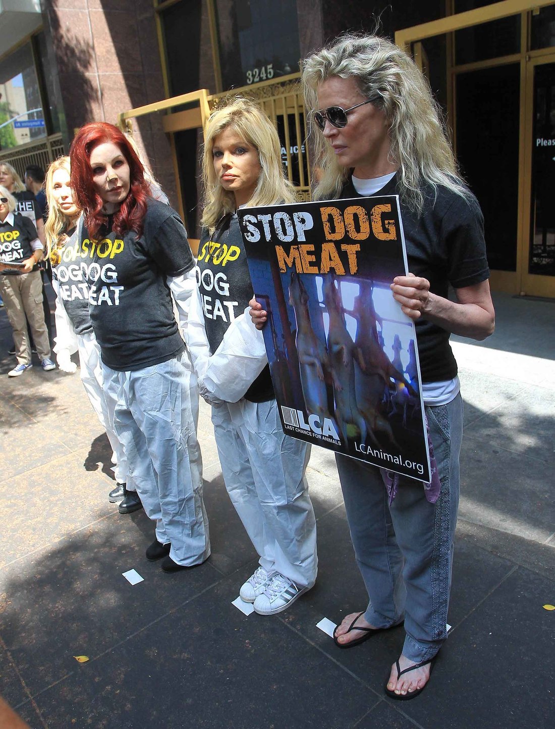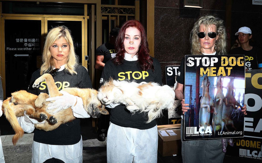 Η 64χρονη Basinger και η 73χρονη Presley εμφανίστηκαν φορώντας λευκά γάντια και μπλουζάκια που έγραφαν “stop dog meat”. Σύμφωνα με τα δημοσιεύματα τα νεκρά σκυλιά που κρατούσαν οι διαδηλωτές ήταν από ένα κτηνιατρείο και “χρησιμοποιήθηκαν” για να δείξουν πώς αυτά τα υπέροχα ζωάκια (όλα τα ζωάκια είναι υπέροχα) αποτελούν εκλεκτό μεζέ σε χώρες σαν τη Νότια Κορέα.