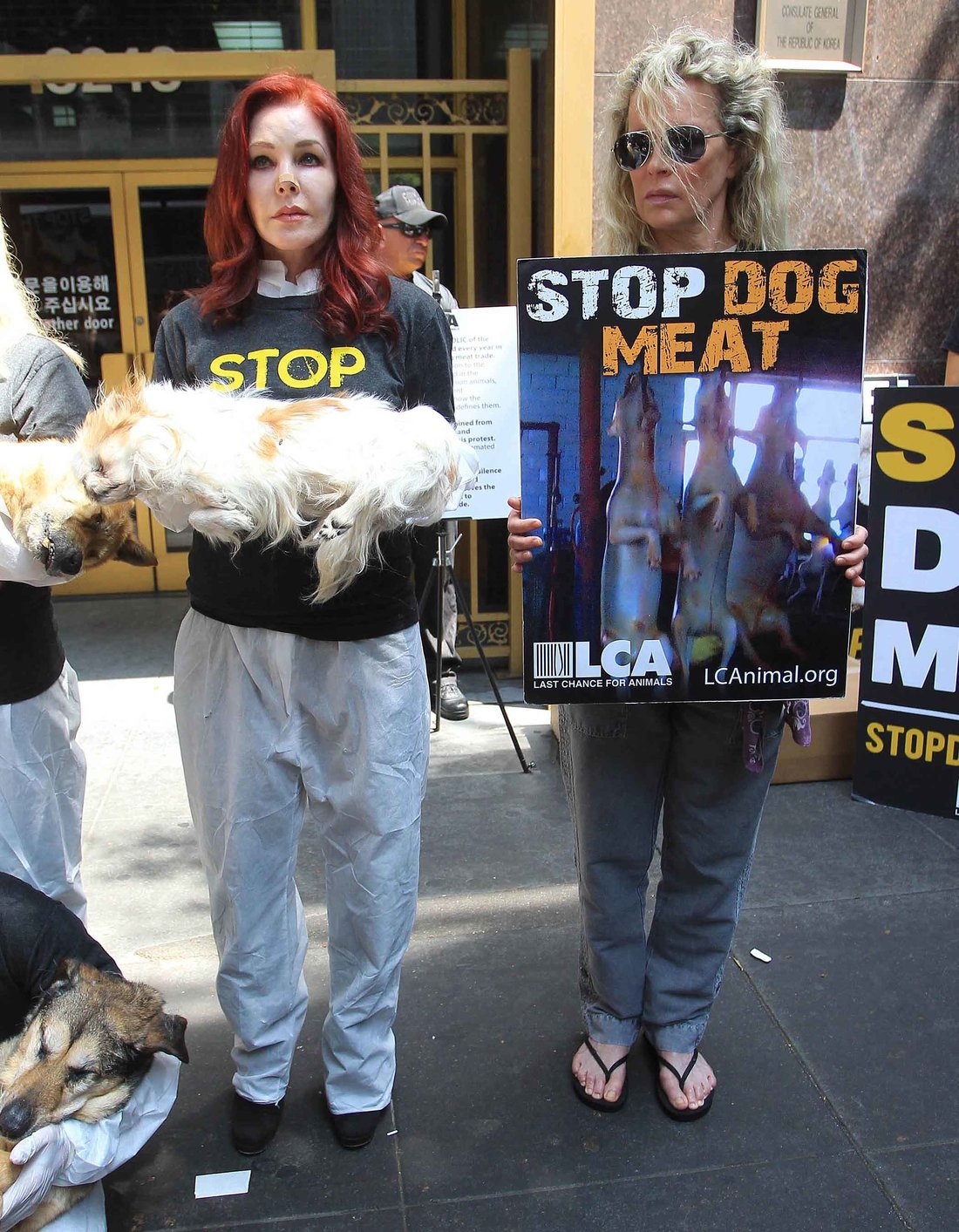 Σε μια διαδήλωση που έγινε έξω από την πρεσβεία της Νότιας Κορέας στο Λος Άντζελες κατά της βιομηχανίας σκυλίσιου κρέατος της χώρας πήραν μέρος αυτές τις μέρες η Αμερικανίδα ηθοποιός Kim Basinger και η πρώην σύζυγος του Elvis Presley, Priscilla Presley, η οποία κρατούσε ένα νεκρό σκύλο.