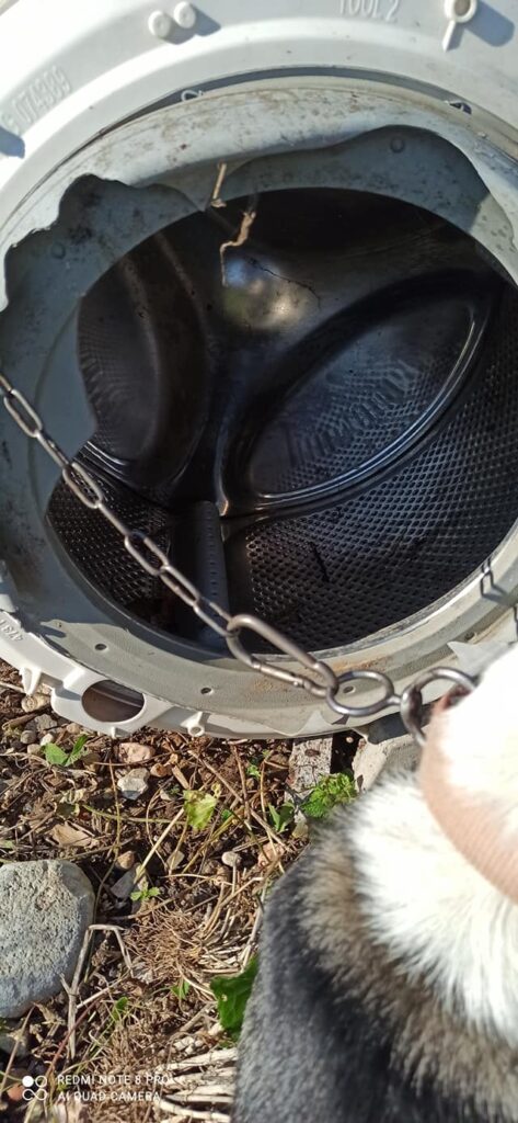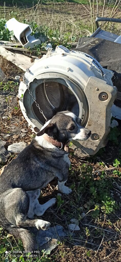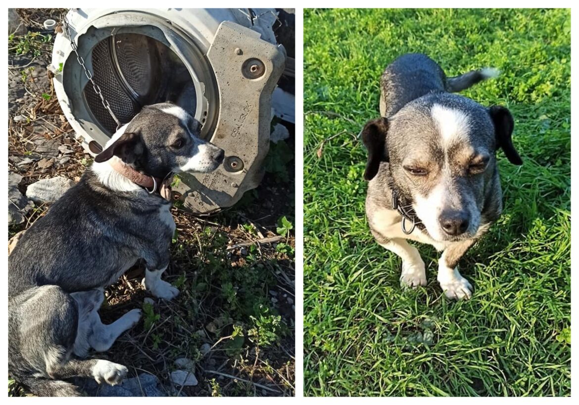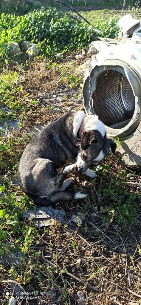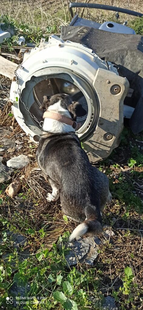 Πρόκειται για ένα σκυλάκι, το οποίο είχαν δέσει, σε ένα χωριό της Σάμου, με κοντή αλυσίδα σε έναν…κάδο πλυντηρίου, σε περιοχή που πετάνε σκουπίδια. Η φαντασία του ανθρώπου, όταν πρόκειται να βασανίσει ένα ζώο, δεν έχει όρια. Ξέραμε τα βαρελόσκυλα. Τώρα είδαμε και σκυλιά δεμένα σε κάδους πλυντηρίου.