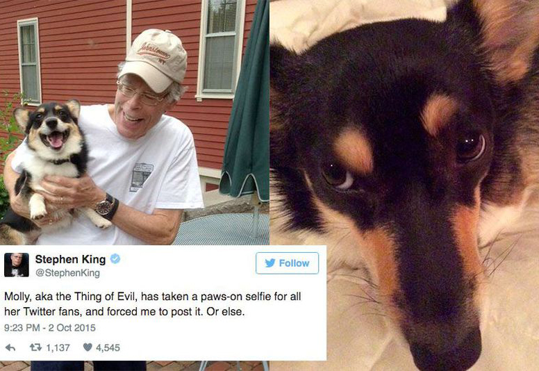 Το 2014 ο δημοφιλής συγγραφέας υιοθέτησε ένα σκυλάκι, ράτσας Corgi, στο οποίο έχει μεγάλη αδυναμία. Η Molly, όπως την έχει ονομάσει, αποτελεί την έμπνευσή του όταν γράφει. Το Δεκέμβριο του 2015 ο King παρουσίασε για πρώτη φορά στους fans του στο Instagram τη Molly, την οποία αποκαλεί “Τhe Thing of Evil”. Πώς άλλωστε θα μπορούσε να την αποκαλέσει ένας μάστερ του φόβου;