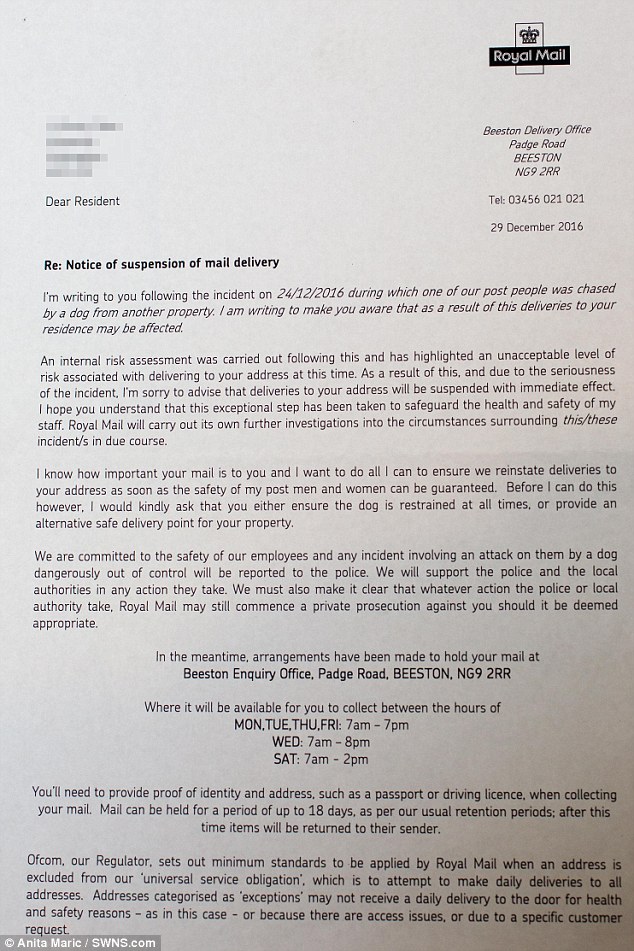 Έτσι μια μέρα έκανε παράπονα στους ανώτερούς του και αποφάσισε να μην ξαναπάει εκεί. Ο λόγος μάλιστα, σύμφωνα με αυτόν, ήταν ότι ρισκάρει τη ζωή του καθώς το σκυλί του γαβγίζει συνέχεια με αποτέλεσμα να φοβάται μην του επιτεθεί. Έτσι η διεύθυνση του ταχυδρομείου πήρε απόφαση να σταματήσει να στέλνει στην περιοχή εκεί ταχυδρόμους χαρακτηρίζοντας την επαφή με τη Missy, έτσι λένε το σκύλο, ένα μικρόσωμο ποιμενικό σέτλαντ, ως ρίσκο. Επιπλέον τόνισε ότι το σκυλί όχι μόνο γαβγίζει στον ταχυδρόμο αλλά και τον έχει κυνηγήσει για να φύγει μακριά από το σπίτι.