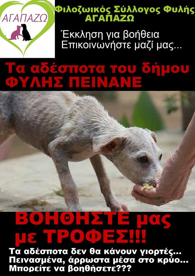 Έκκληση για βοήθεια κάνουν οι εθελοντές του Φιλοζωικού Συλλόγου Φυλής “ΑΓΑΠΑΖΩ” για τα αμέτρητα αδέσποτα που βρίσκονται στους δρόμους και σε ερημικές τοποθεσίες και πεινάνε, είναι άρρωστα, ετοιμόγεννα και κακοποιημένα. Δείτε τι γράφουν στη σελίδα τους στο facebook και βοηθήστε. Ακόμα και 2 ευρώ είναι πολύτιμα. Είναι μια κονσέρβα φαγητό, κάτι πολύ σημαντικό.