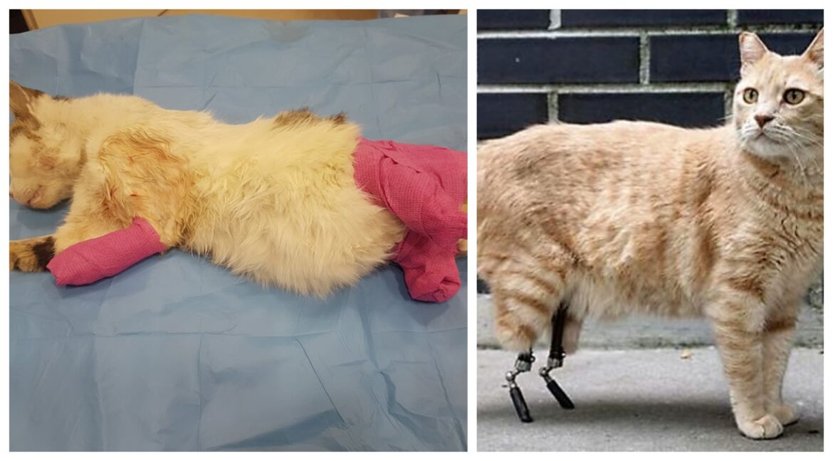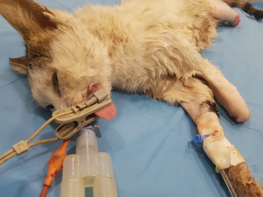 Το γατάκι πήγε στο κτηνιατρείο. Η περίπτωσή του ήταν, όπως καταλαβαίνουμε, ιδιαίτερη και φοβερά δύσκολη. Οι εθελοντές, αφού σταθεροποιήθηκε η υγεία του μετά από πολύ αγώνα, ξεκίνησαν την επικοινωνία με εξειδικευμένους γιατρούς ώστε να δουν πώς θα αντιμετωπίσουν το ζήτημα των ποδιών του. Η σκέψη τους ήταν τα πρόσθετα μέλη ή κάποιο ειδικό καρότσι. Το επίσης τραγικό ήταν ότι ο μικρούλης ήταν και πυροβολημένος από αεροβόλο όπλο στο δεξί πόδι πάνω από το γόνατο.