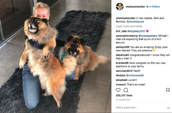 Με μια δημοσίευσή της στα social media η Handler επανέρχεται δείχνοντας στους διαδικτυακούς της φίλους τη νέα της παρέα, δυο όμορφα σκυλάκια Chow Chow, τα οποία πήραν τη θέση του σκύλου της που πέθανε. Ο Bert και η Bernice, όπως τα ονόμασε, σώθηκαν και αυτά την τελευταία στιγμή από ευθανασία.