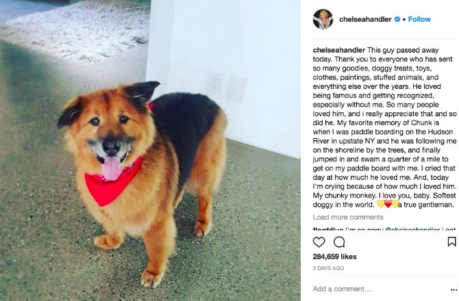 Πριν από λίγες μέρες η δημοφιλής Αμερικανίδα παρουσιάστρια Chelsea Handler μοιράστηκε μέσω της σελίδας της στο Instagram το θάνατο του αγαπημένου της σκύλου του Chuck. Ο Chuck ήταν ένα γλυκύτατο ημίαιμο Chow Chow με γερμανικό ποιμενικό, το οποίο η Handler είχε σώσει από ευθανασία σε ένα καταφύγιο. Τον αποκαλούσε chunky monkey και τον λάτρευε.